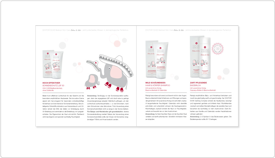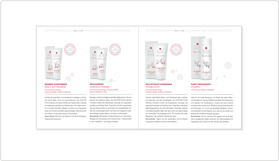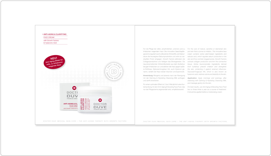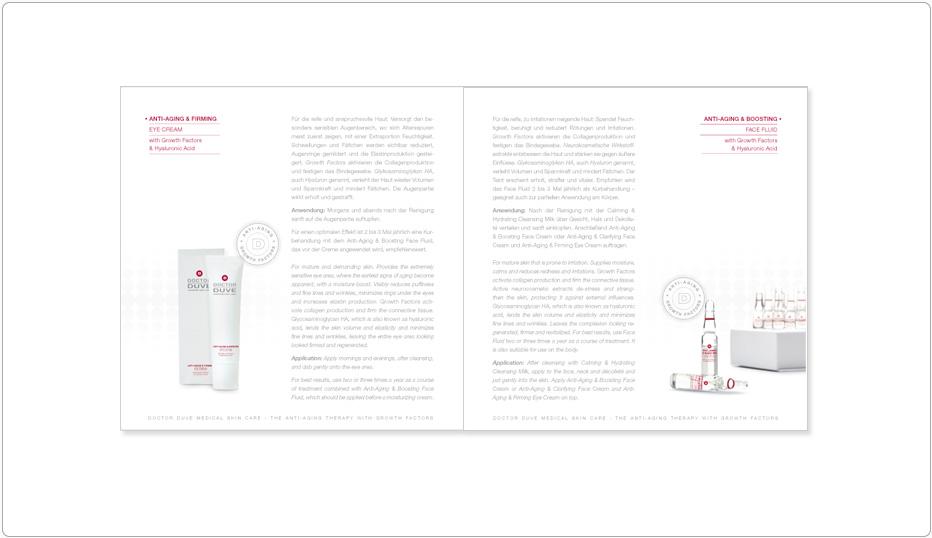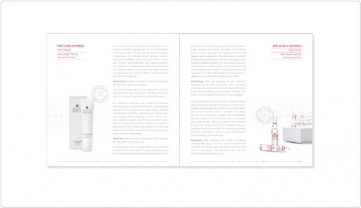 Umsetzung: Für die Pflegelinien wurden zwei Folder entwickelt. In Beiden wird der Verbraucher über die Marke, die Inhaltsstoffe und deren Wirkung und Wirkstoffe Informiert. Wie auch bei allen anderen Kommunikations-Maßnahmen spiegeln sich die USP´s der Marke in der Gestaltung wider: dermatologische Erfahrung, kosmetische Kompetenz und wissenschaftliche Seriosität des Arztes.