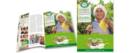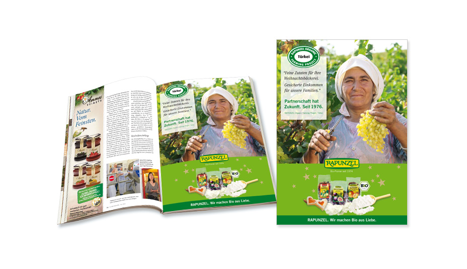 Aufgabe: Neues Anzeigenkonzept. In den Anzeigen wird das “Türkei-Projekt” von Rapunzel und die Produkte aus diesem Projekt vorgestellt. Das neue Konzept bewegt sich im Rahmen des bestehenden CI´s von Rapunzel.